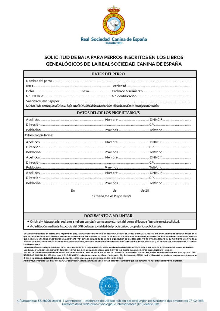 Para solicitar la baja en el LOE o RRC de la Real Sociedad Canina de España, es necesario cumplimentar el impreso destinado a tal fin, aportando la documentación requerida, y pagar el importe que corresponda a esta tramitación, según la tarifa de precios vigente en cada momento.