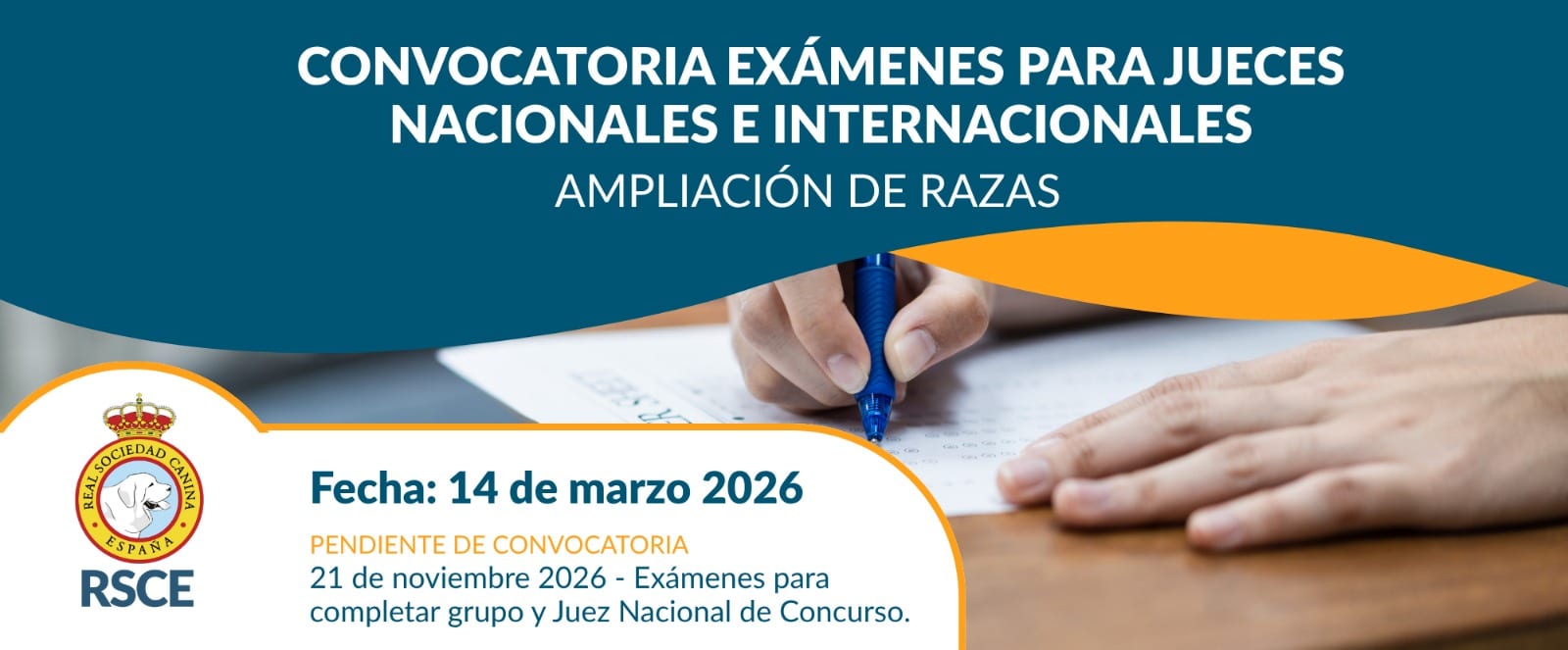 La Real Sociedad Canina de España (RSCE) convoca examen para Jueces Nacionales e Internacionales que deseen ampliar razas de los grupos FCI. Serán el próximo14 de marzo de 2026 y se comunicará, próximamente, el lugar y la hora.