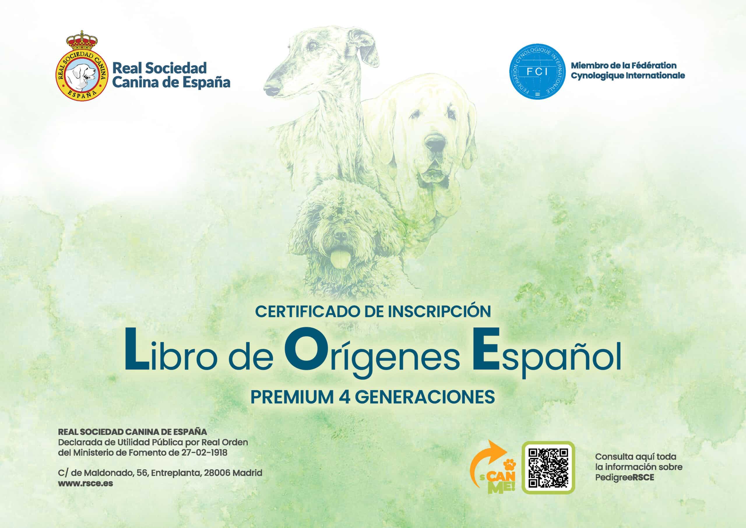 El PedigreeRSCE PREMIUM, con certificación genética, ofrece acceso completo a todos los servicios de la RSCE. Permite la cría con sello FCI, las exportaciones oficiales, la participación en exposiciones y pruebas sin limitaciones, el acceso a rankings oficiales, la inclusión en el libro de reproductores y la participación en programas de criadores. Una acreditación pensada para quienes buscan el máximo nivel de reconocimiento, proyección y respaldo oficial para su ejemplar.